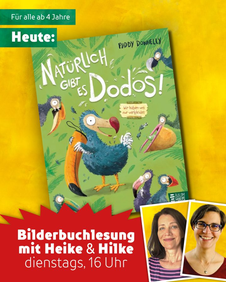 Ein lustiges Bilderbuch zum Suchen und Mitraten. Mit spannenden Infos zu bedrohten und ausgestorbenen Tierarten Wir alle wissen, dass Dodos ausgestorben sind. Richtig? Nein, falsch, sind sie nicht! Sie haben sich nur verkleidet. Deshalb : Also haltet die Augen offen, man weiß nie, wo sie sich verstecken … Ab 4 Jahre https://buecherwurm-braunschweig.buchhandlung.de/shop/article/50386415/paddy_donnelly_natuerlich_gibt_es_dodos_wir_haben_uns_nur_verkleidet.html